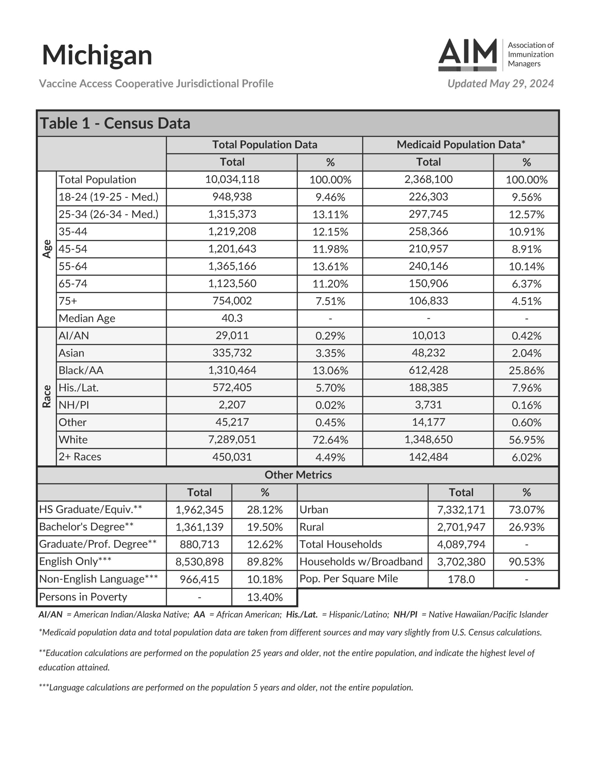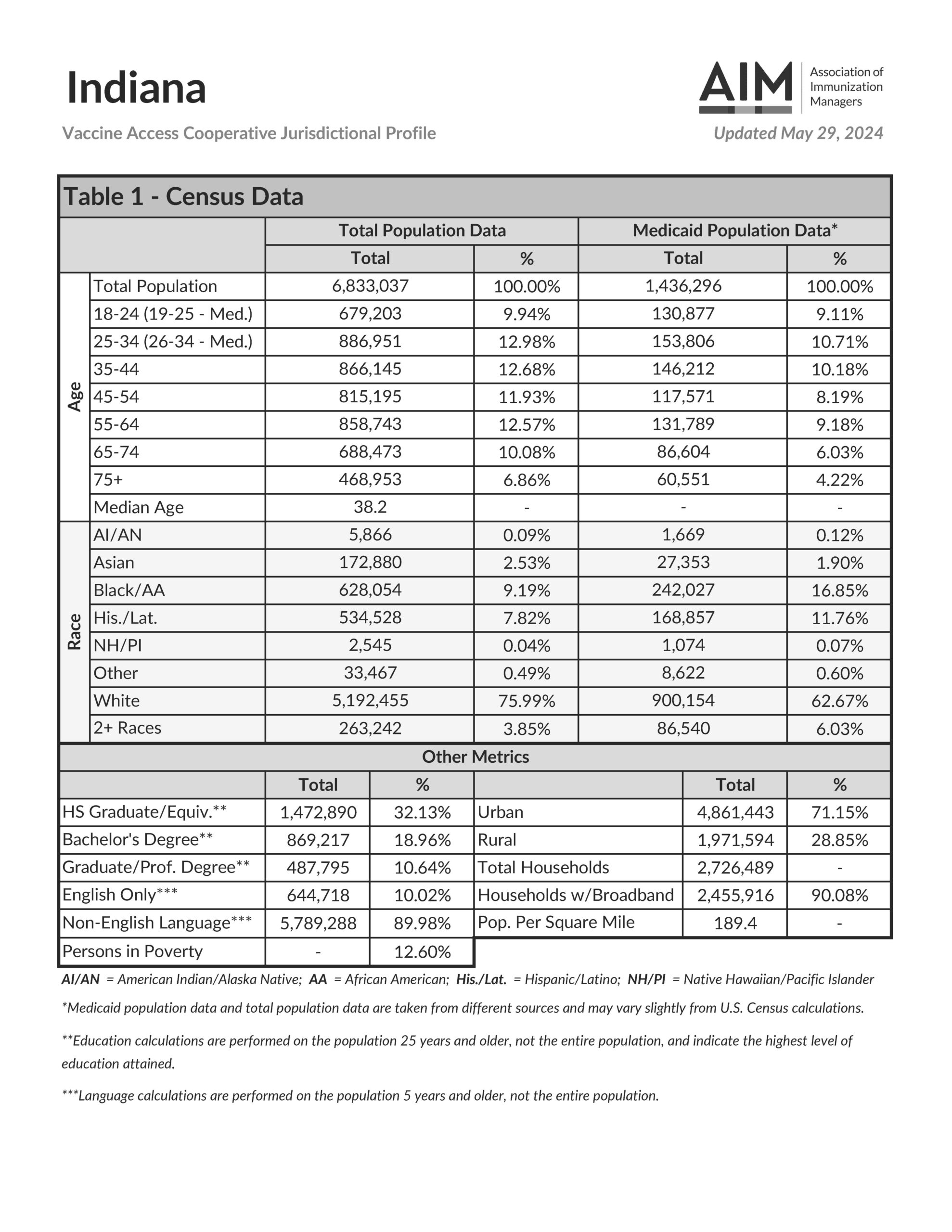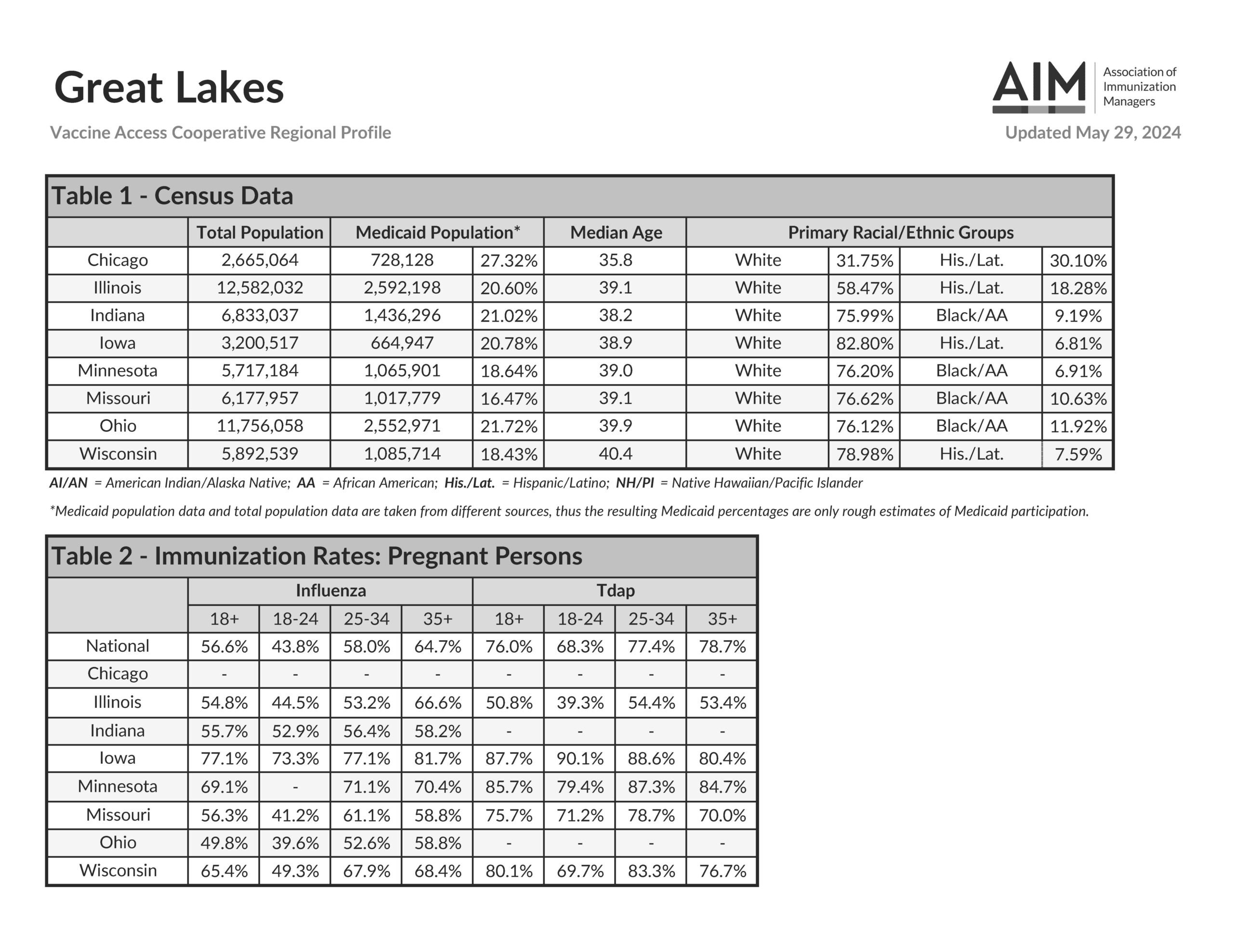 This collection of jurisdiction profiles details AIM’s Great Lakes region. As part of the Vaccine Access Cooperative (VAC) project, these profiles include census data, immunization rates of the general population, immunization rates of skilled nursing facilities, immunization rates of pregnant persons, insurance, Medicare, and Medicaid data, immunization information systems (IIS) and data considerations, and policy considerations. If you have any questions, contact us.
