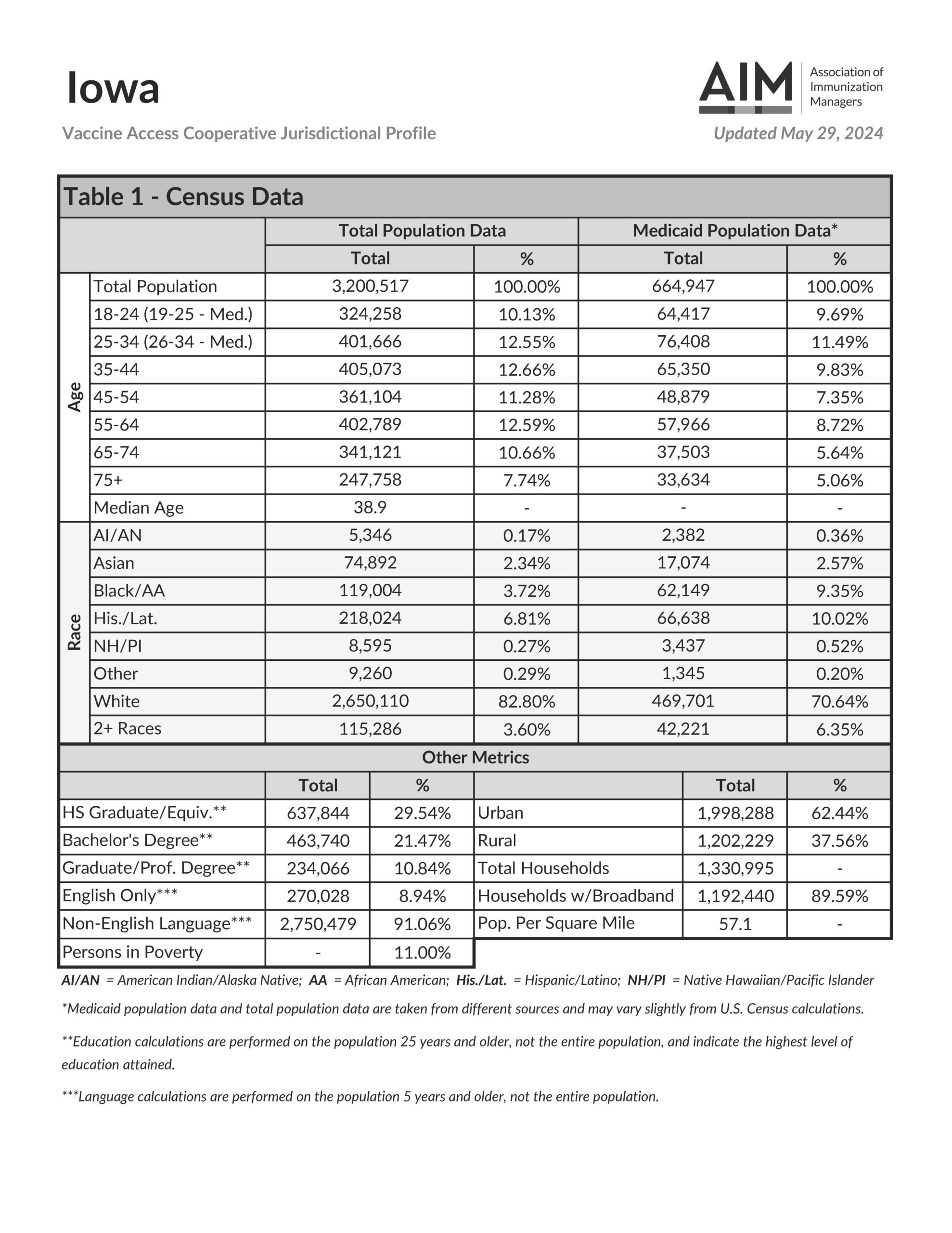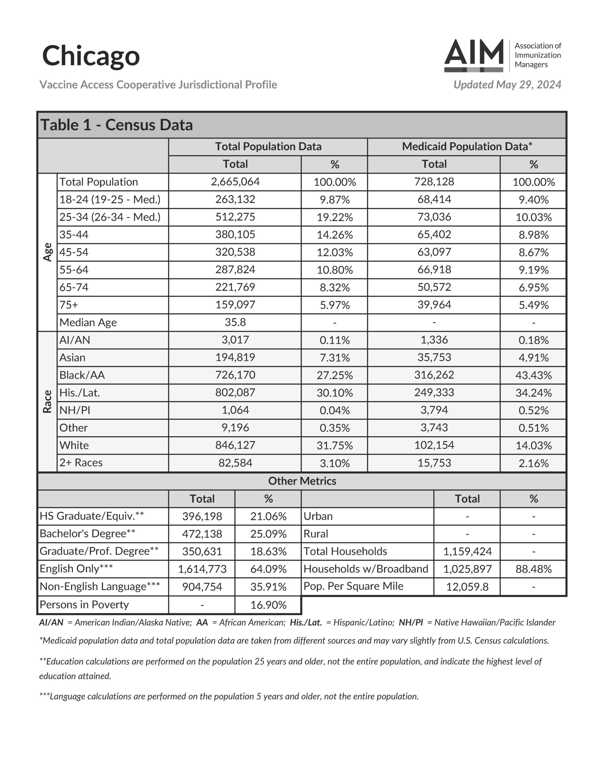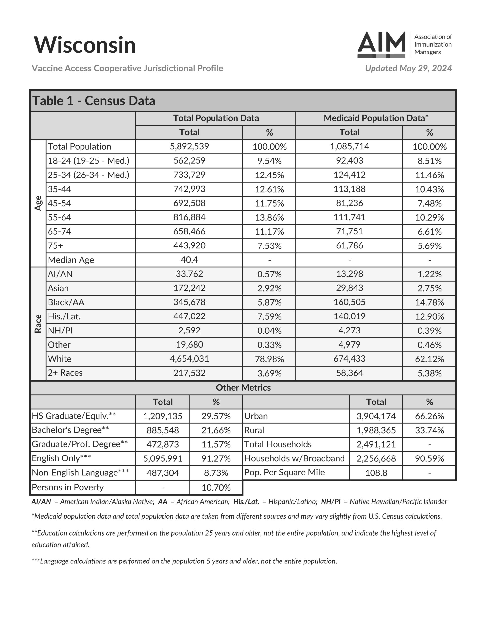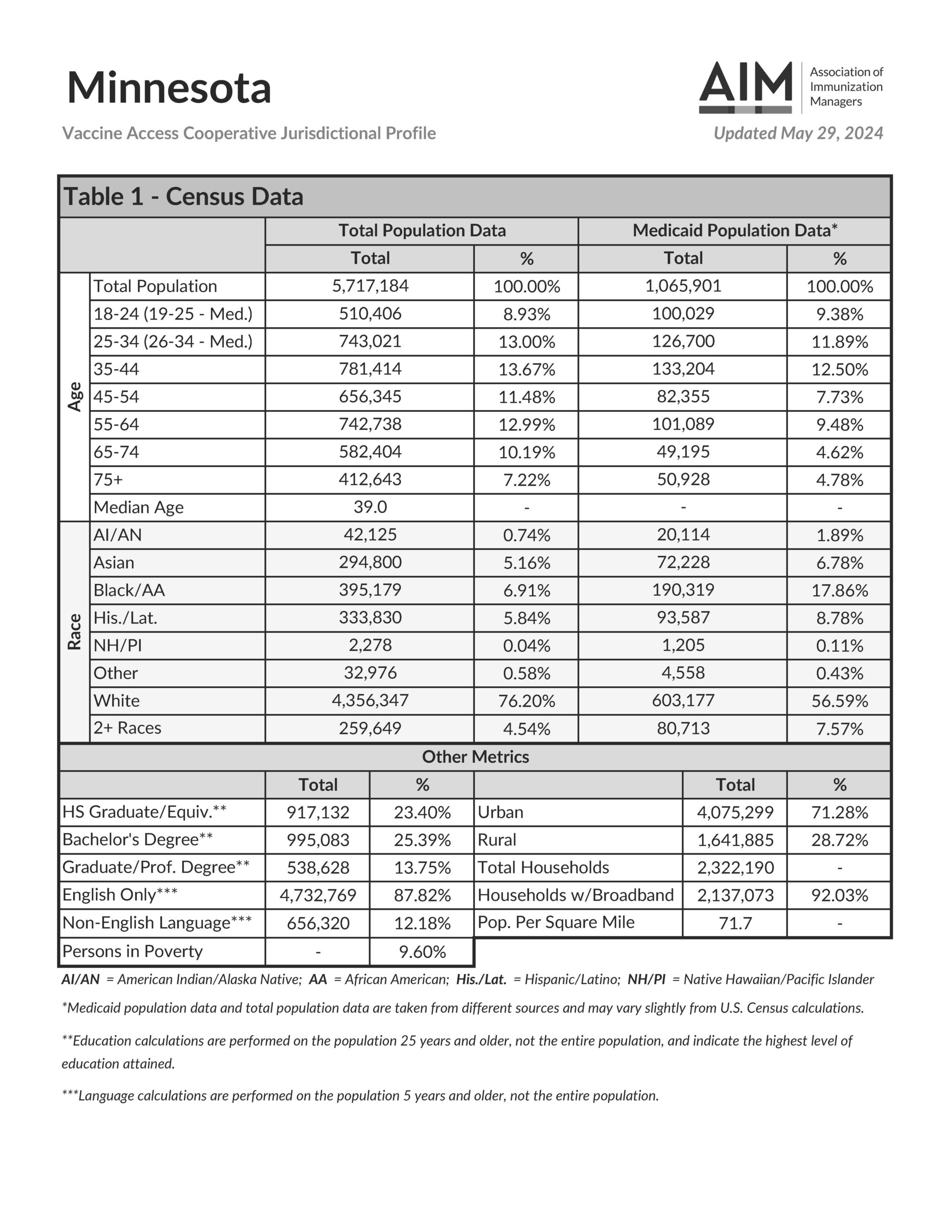 This collection of jurisdiction profiles details AIM’s Great Lakes region. As part of the Vaccine Access Cooperative (VAC) project, these profiles include census data, immunization rates of the general population, immunization rates of skilled nursing facilities, immunization rates of pregnant persons, insurance, Medicare, and Medicaid data, immunization information systems (IIS) and data considerations, and policy considerations. If you have any questions, contact us.