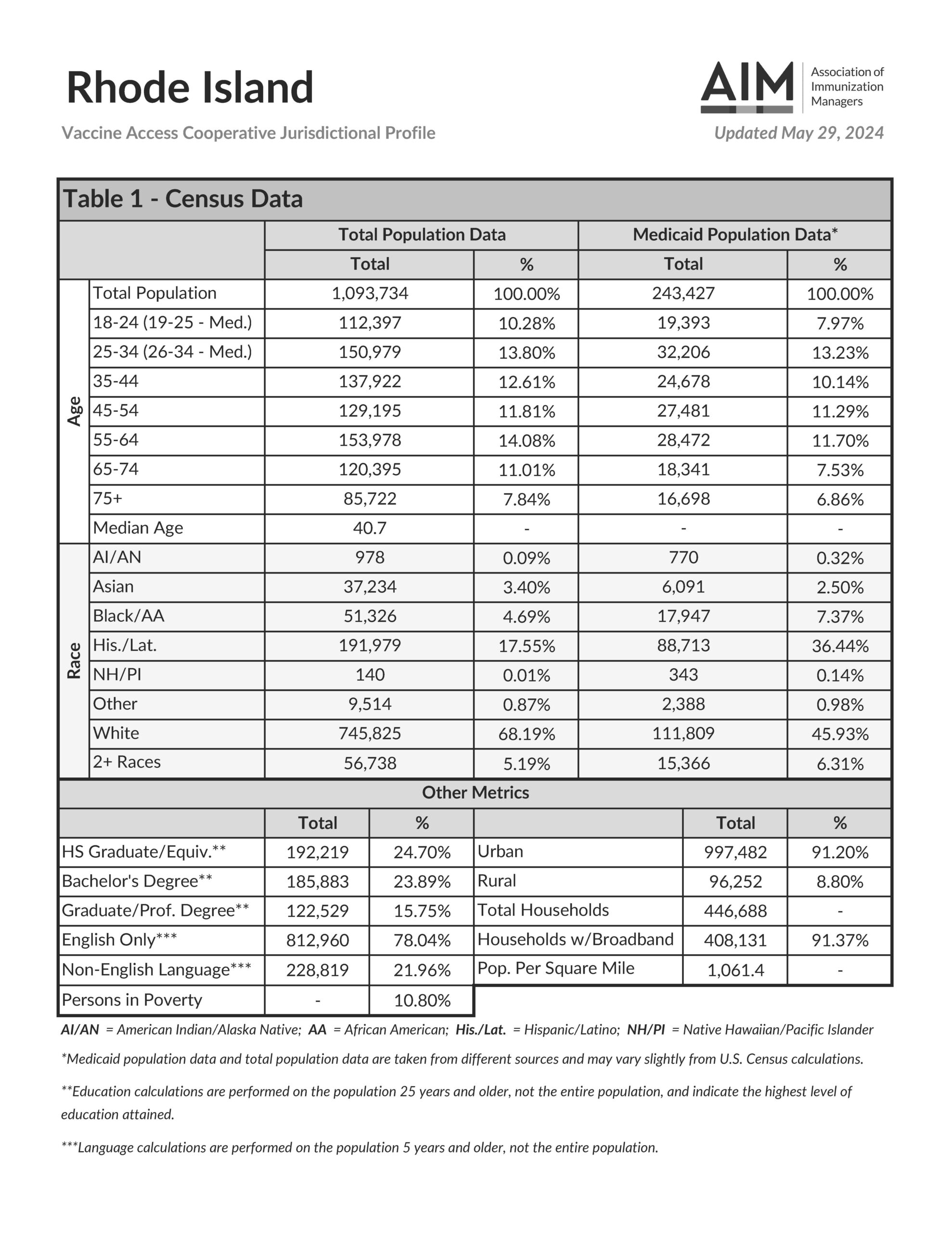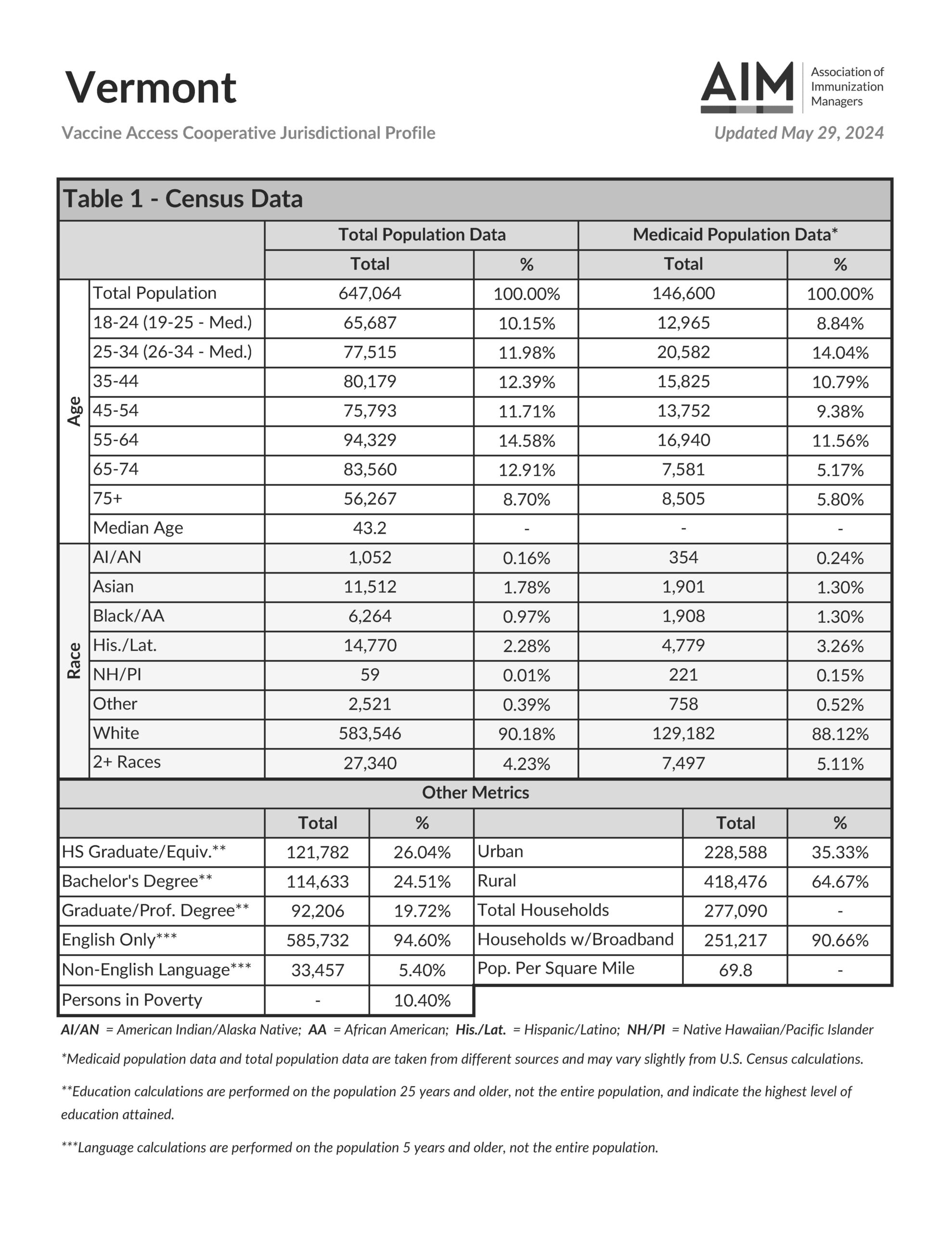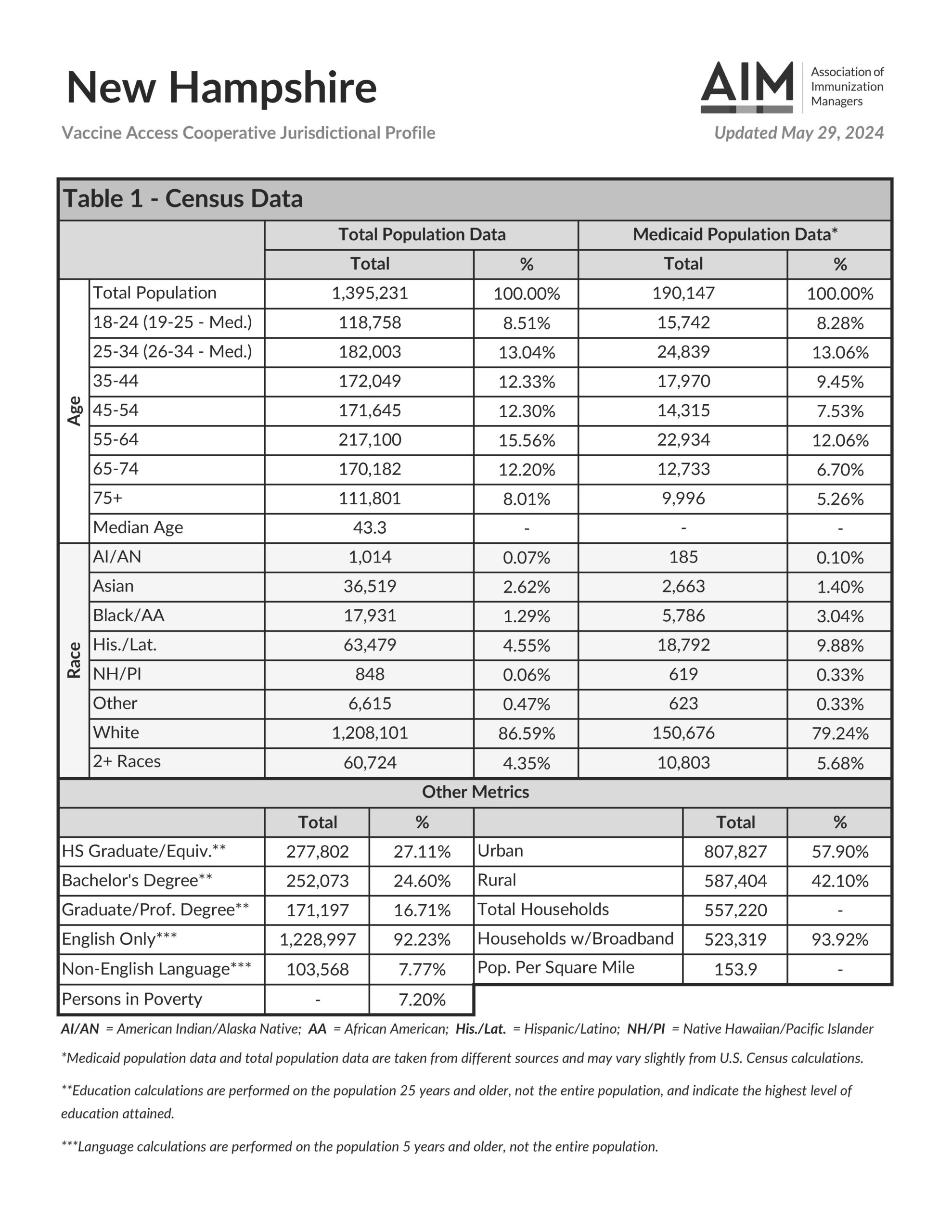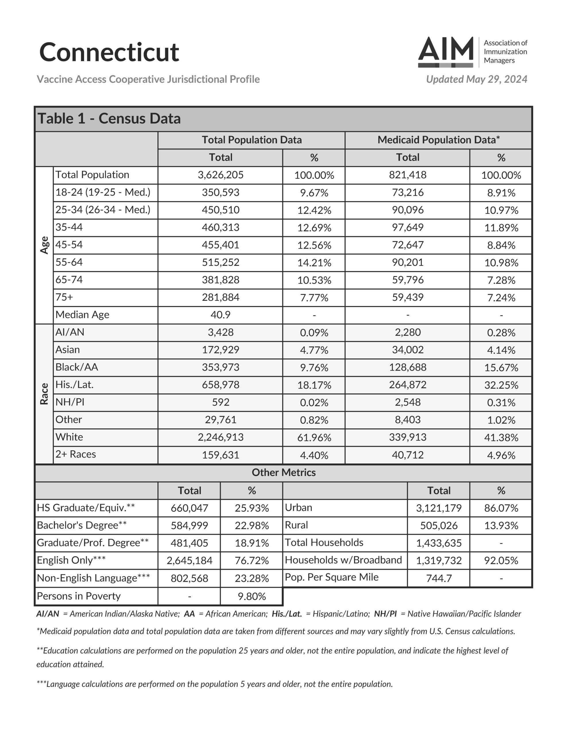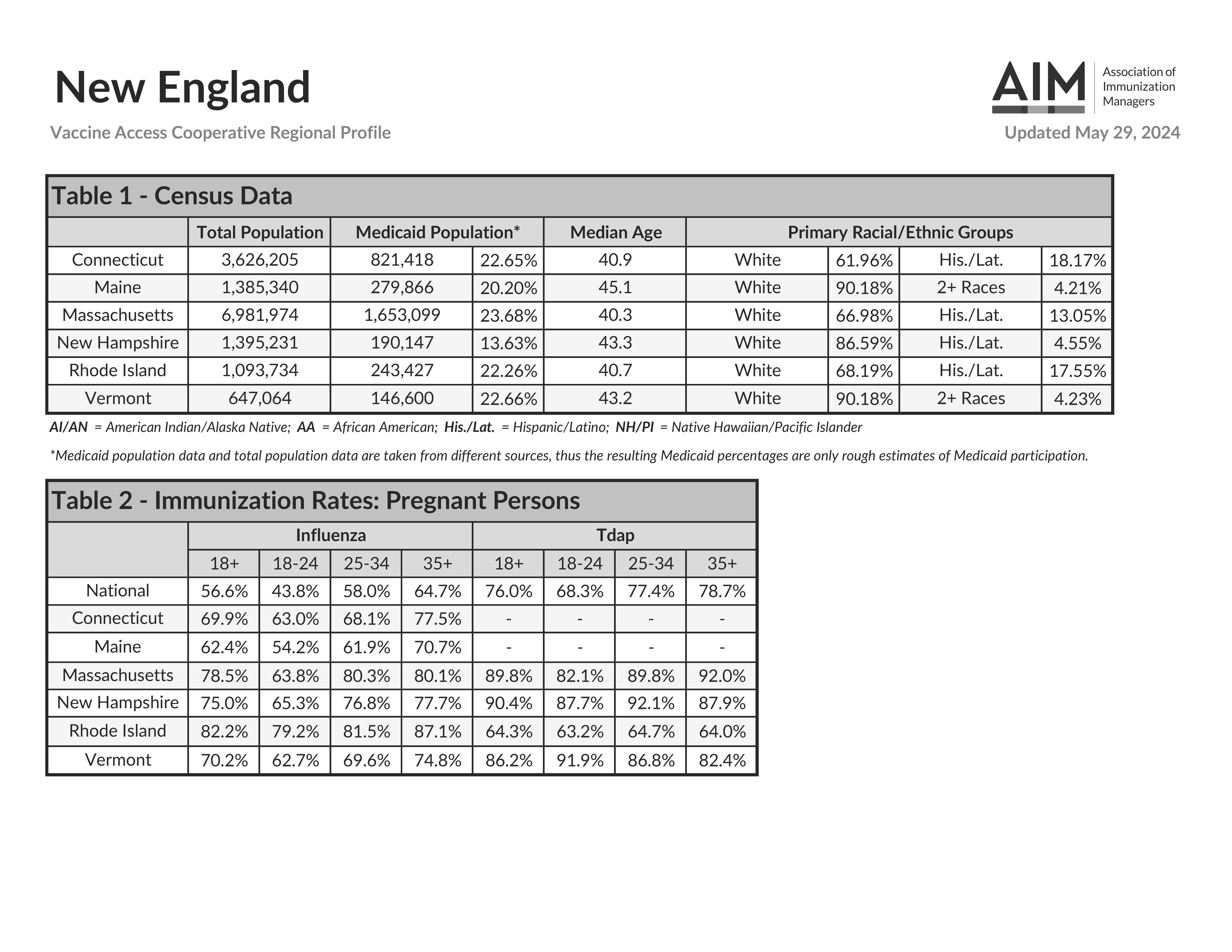 This collection of jurisdiction profiles details AIM’s New England region. As part of the Vaccine Access Cooperative (VAC) project, these profiles include census data, immunization rates of the general population, immunization rates of skilled nursing facilities, immunization rates of pregnant persons, insurance, Medicare, and Medicaid data, immunization information systems (IIS) and data considerations, and policy considerations. If you have any questions, contact us.