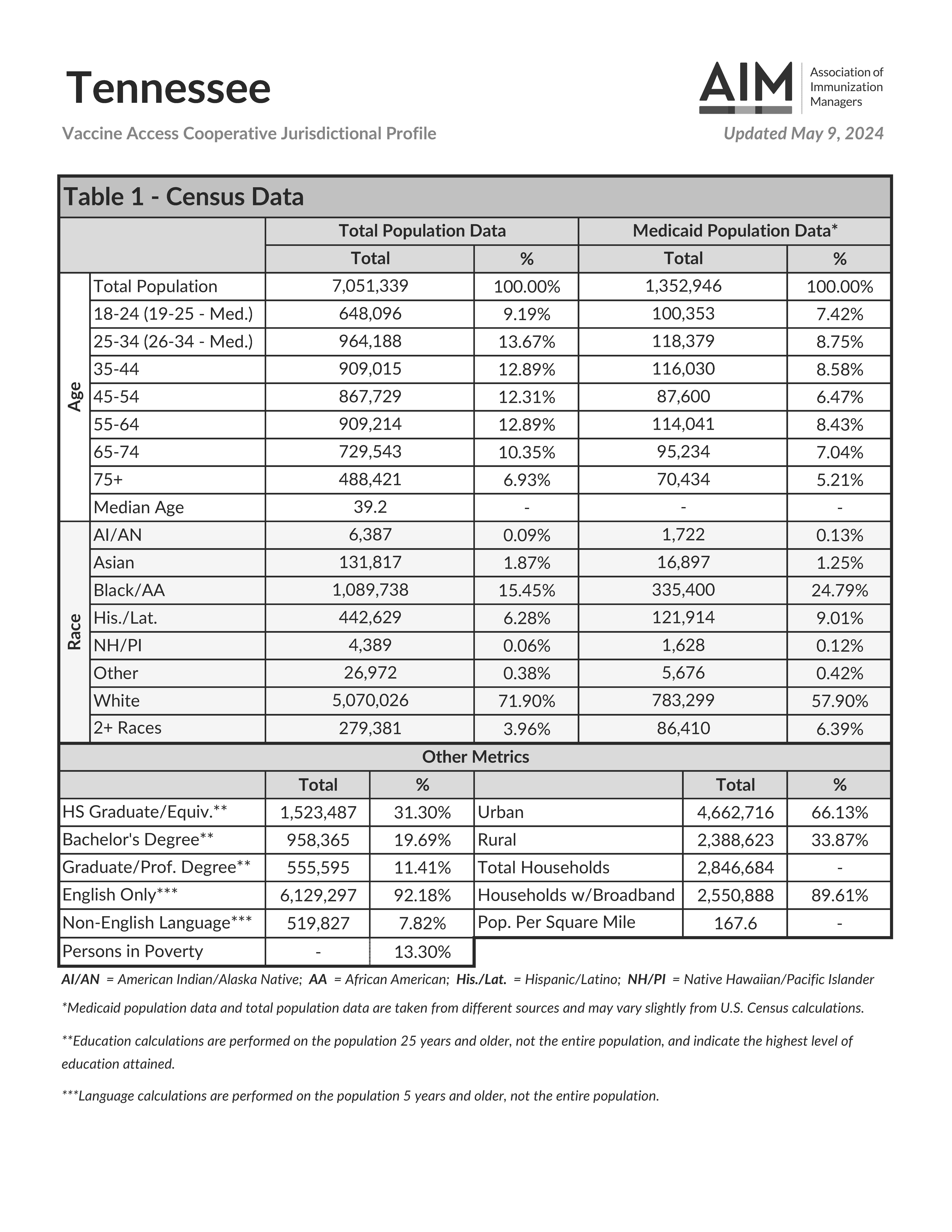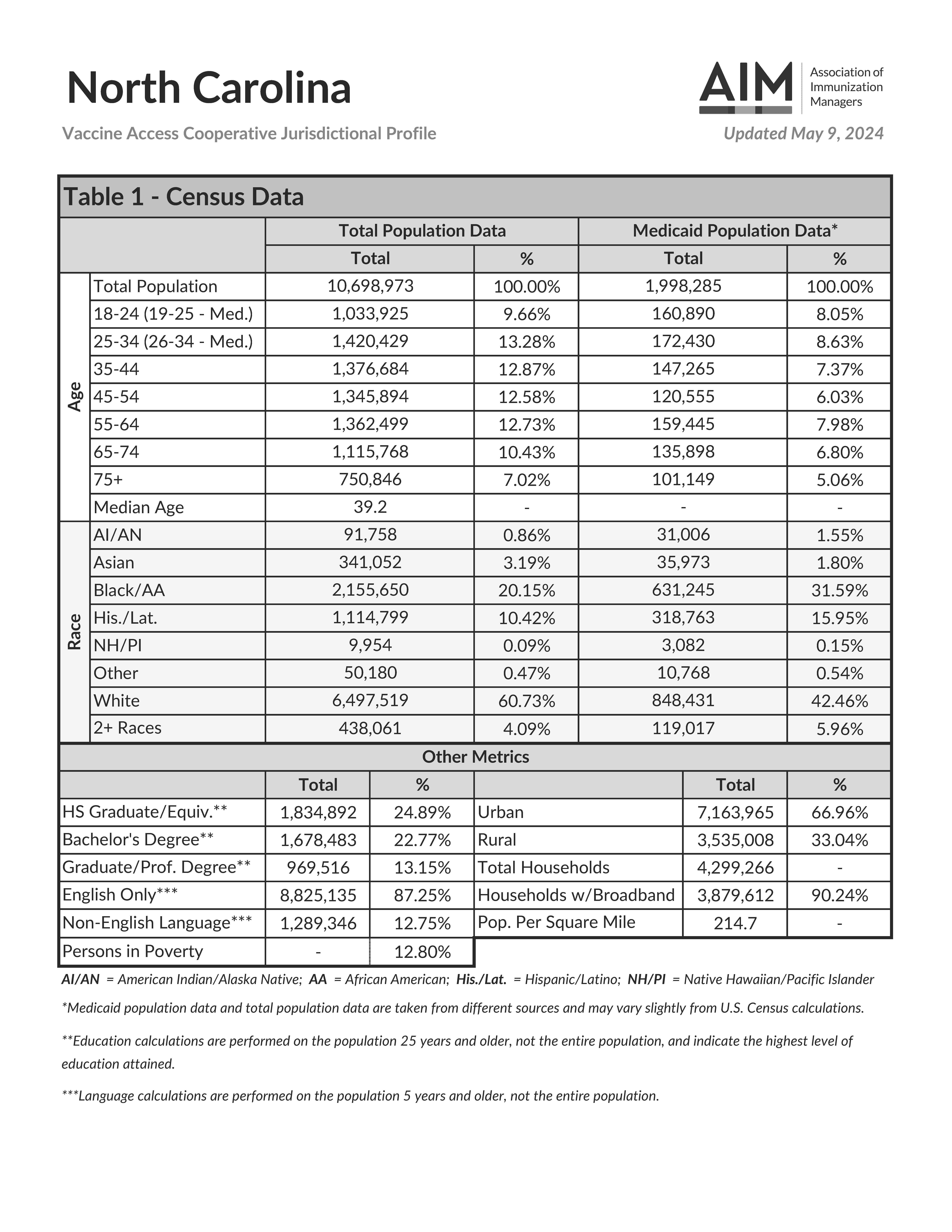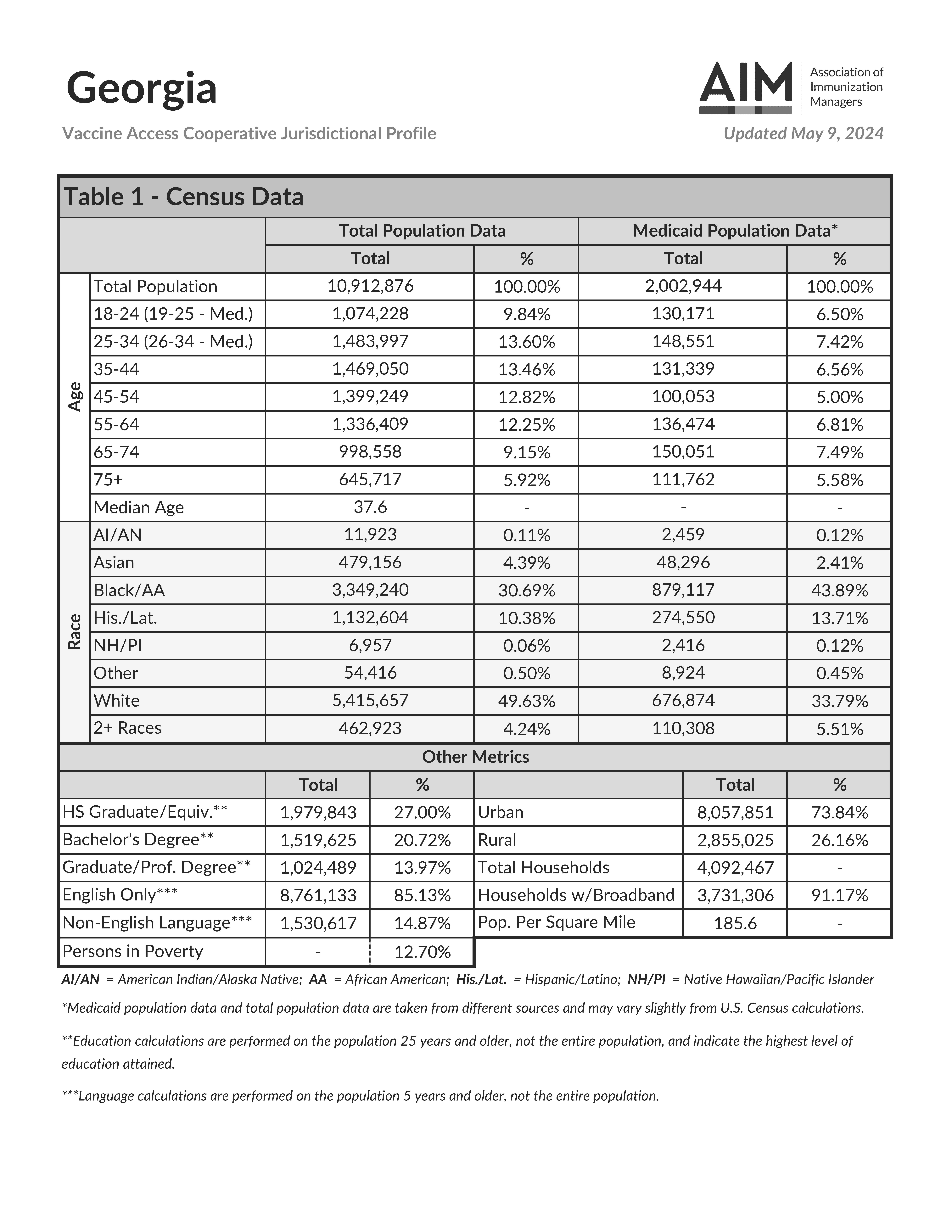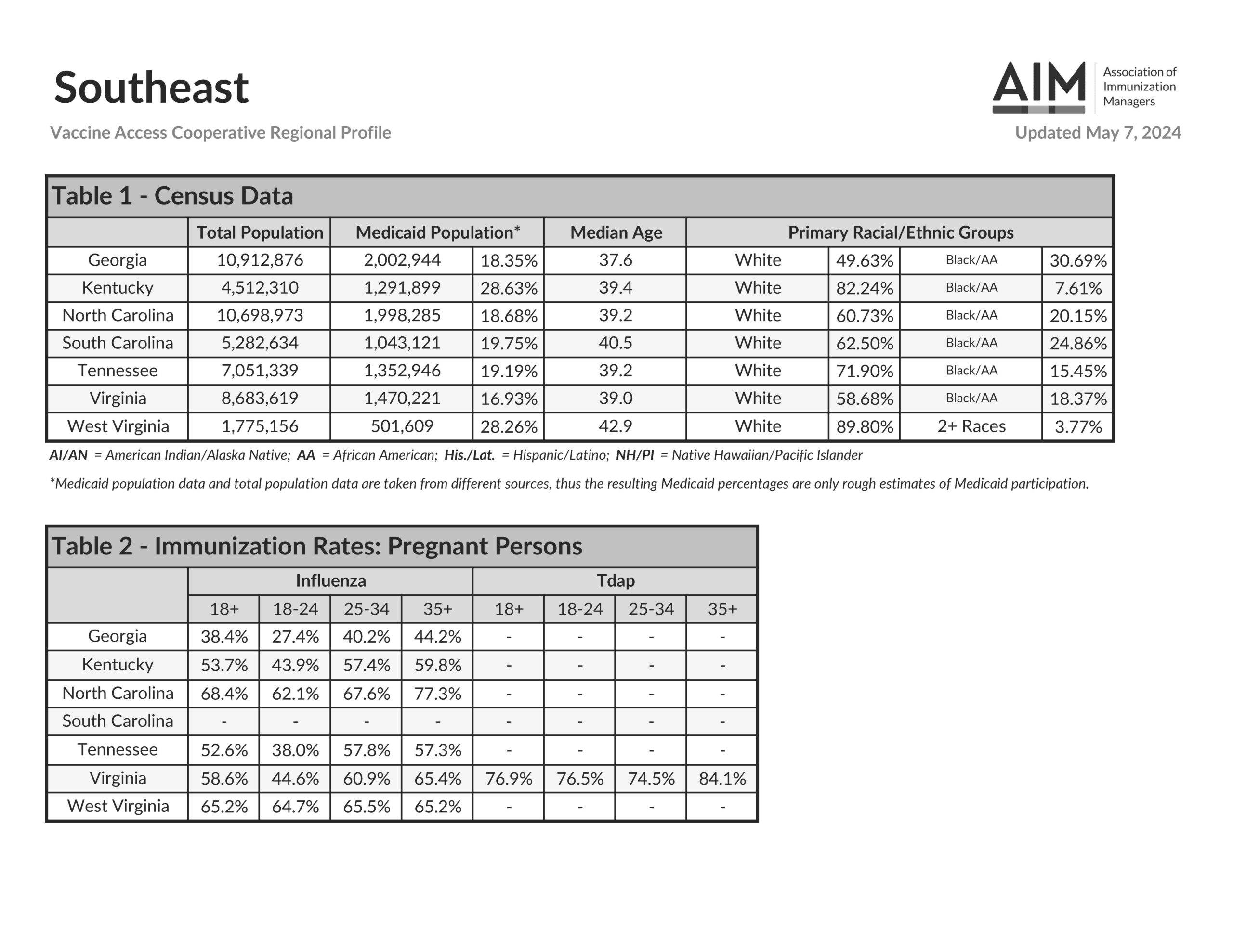 This collection of jurisdiction profiles details AIM’s Southeast region. As part of the Vaccine Access Cooperative (VAC) project, these profiles include census data, immunization rates of the general population, immunization rates of skilled nursing facilities, immunization rates of pregnant persons, insurance, Medicare, and Medicaid data, immunization information systems (IIS) and data considerations, and policy considerations. If you have any questions, contact us.