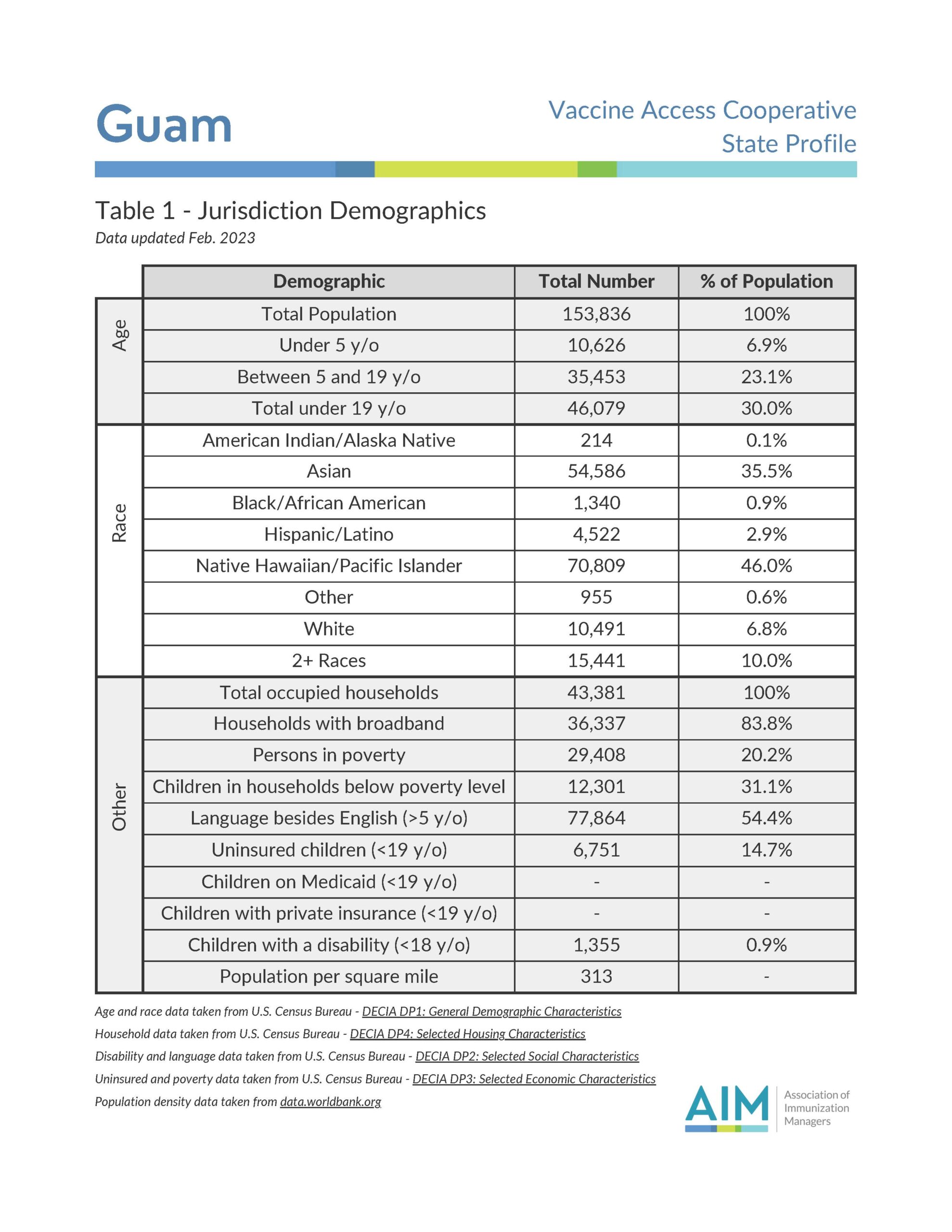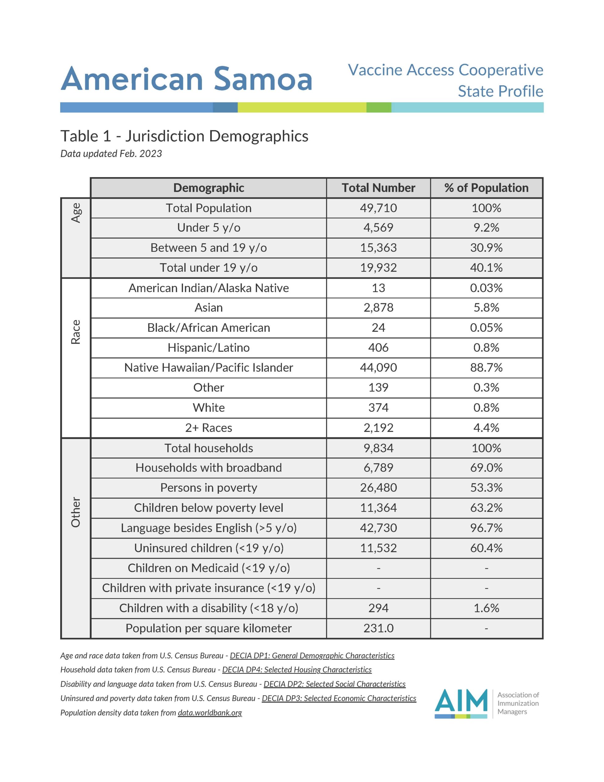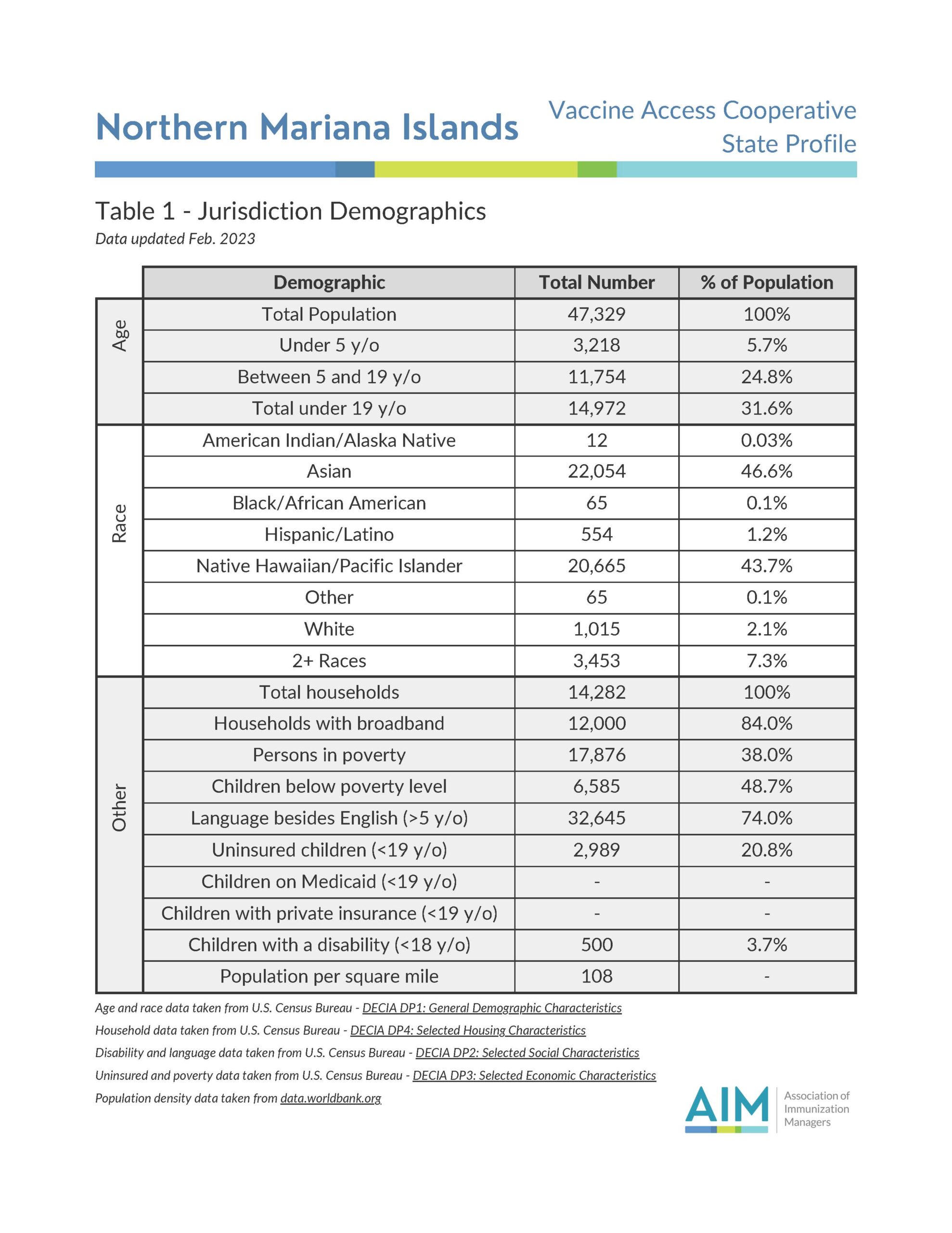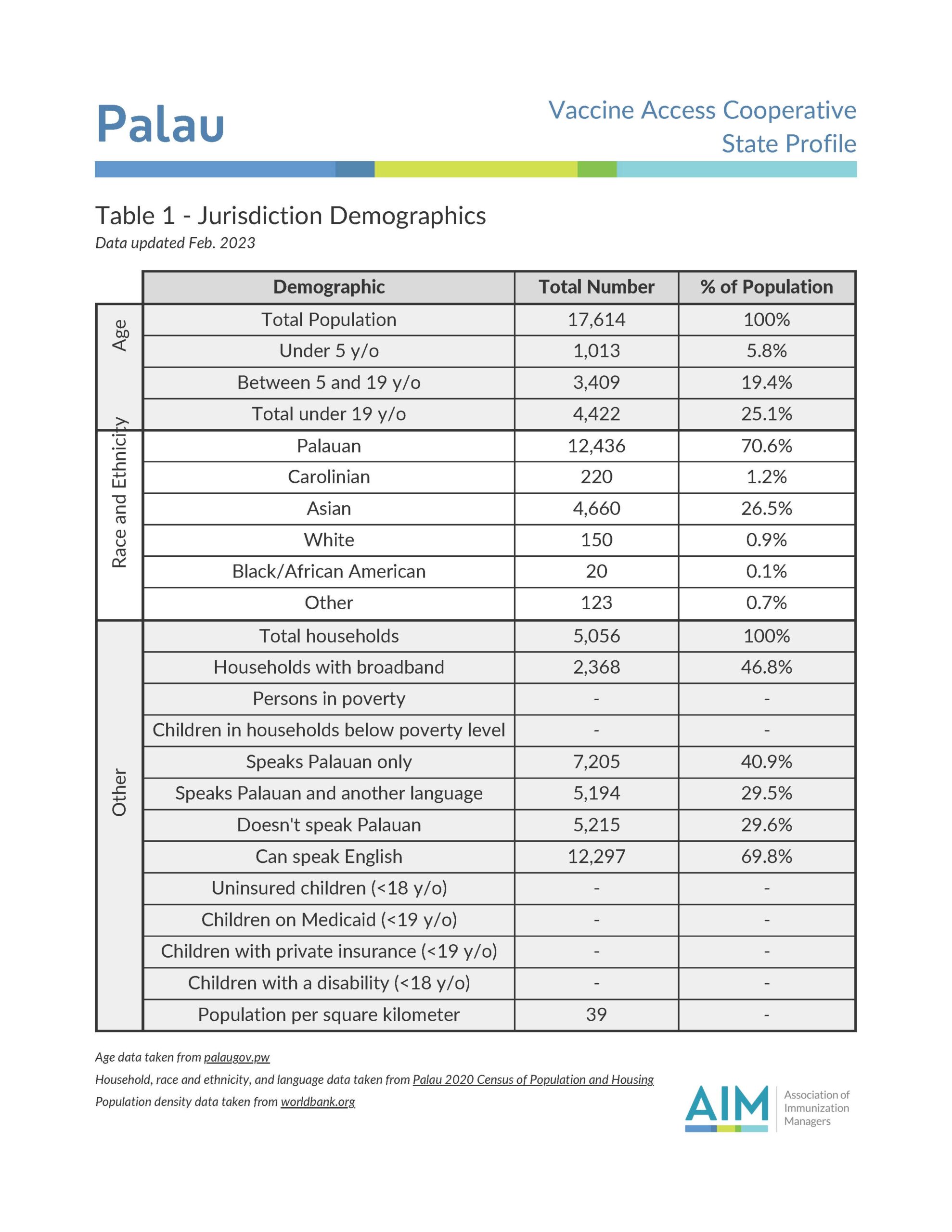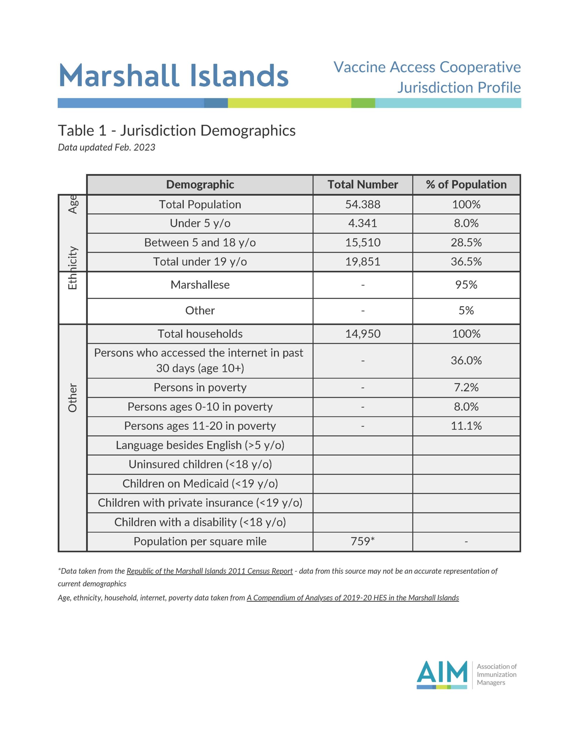 This collection of jurisdiction profiles details AIM’s USAPI region. As part of the Vaccine Access Cooperative (VAC) project, these profiles include jurisdiction demographics, COVID-19 vaccination rates, school vaccine requirements, vaccine coverage and exemption rates among children in kindergarten, and other relevant vaccination details. If you have any questions, contact us.
